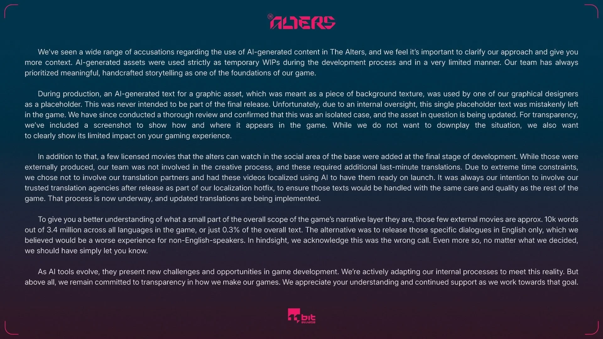 Разработчики заявили, что написанный ИИ текст был использован для графического объекта, который должен был стать частью фоновой текстуры. Он использовался в качестве временного заполнителя и не должен был попасть в финальную версию The Alters — но по недосмотру попал.