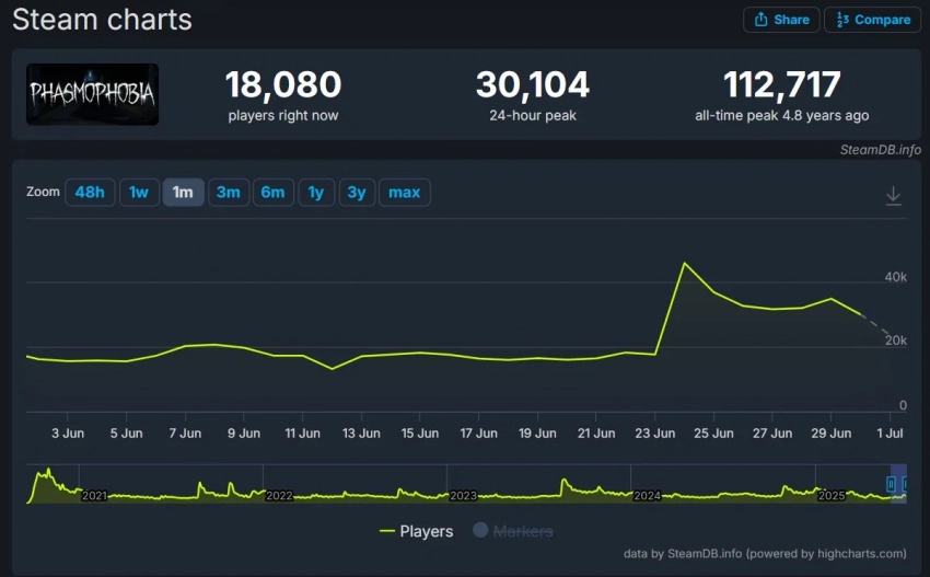 Phasmophobia сейчас доступна на РС с поддержкой VR, PlayStation 5 и Xbox Series. В Steam она собирает крайне положительные отзывы с 95% рекомендаций. По данным SteamDB, игра пользуется интересом: в ней собирается одновременно до 20 тысяч игроков, а распродажа привела к заметному увеличению этого количества.