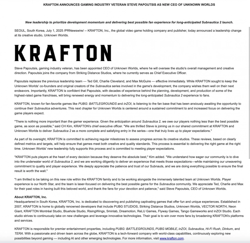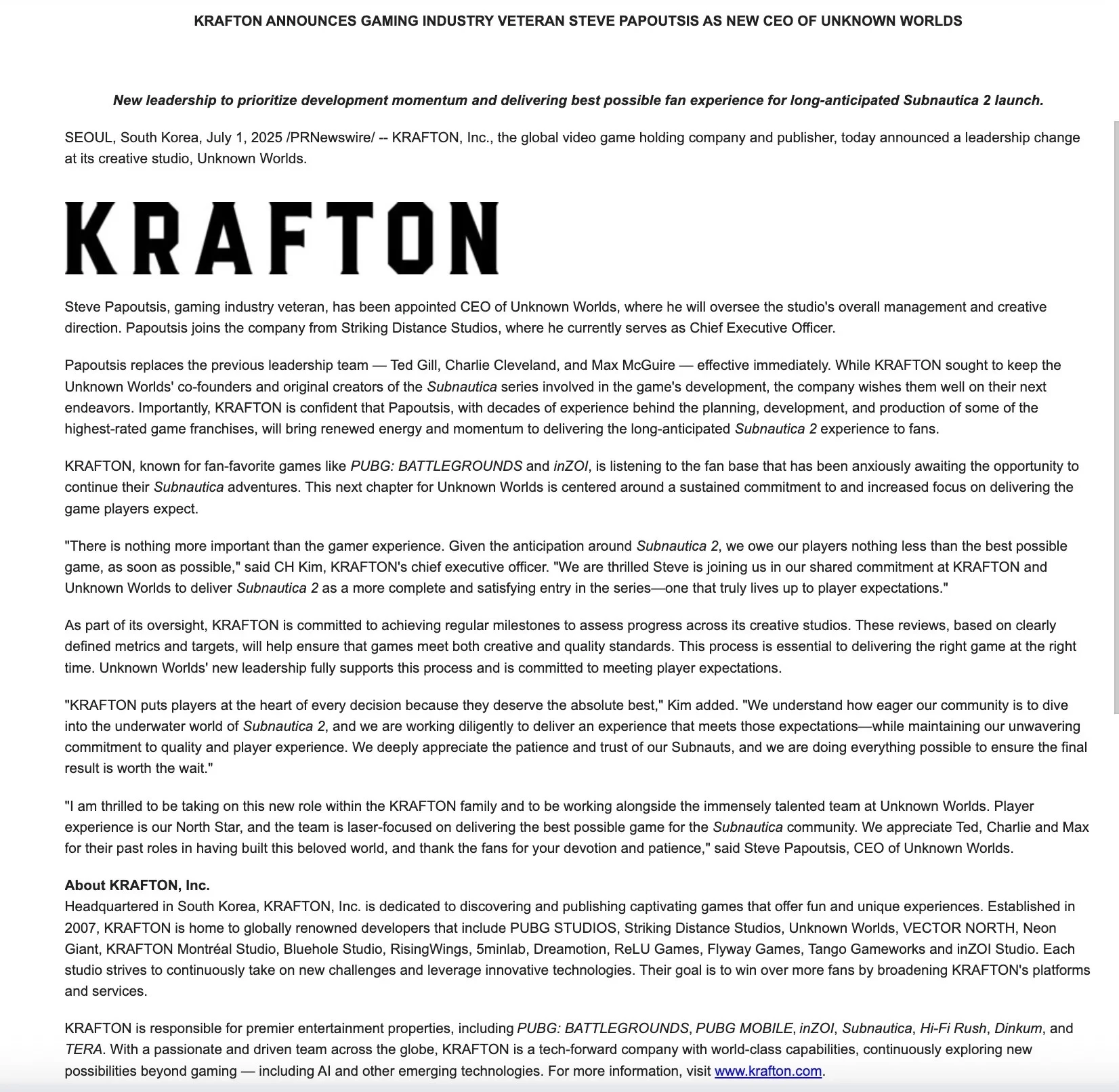 Согласно заявлению Krafton, компания «стремилась сохранить присутствие соучредителей Unknown Worlds и создателей серии Subnautica в дальнейшей разработке», но «желает им всего наилучшего в новых начинаниях».