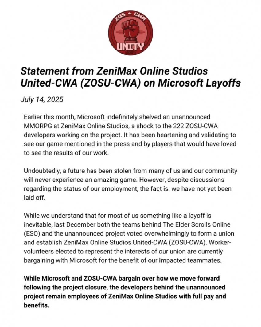 В своём заявлении ZOSU подчёркивает, что у многих сотрудников студии «украли будущее», а геймеры «никогда не увидят потрясающую игру». В настоящее время отстранённые от проекта разработчики остаются в штате ZeniMax Online Studios. Но некоторые сотрудники всё же могут потерять работу в будущем.