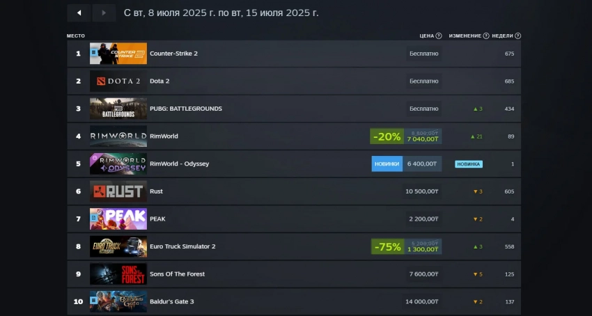 В российском сегменте Steam научно-фантастическая RimWorld также может похвастаться возвращением в первую десятку, но уже на четвёртое место — следом идёт свежее дополнение. Других серьёзных изменений в чарте нет, а закрывает первую десятку Baldur’s Gate 3.