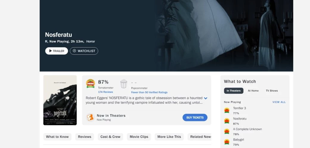 Критики, которым «Носферату» понравился, считают новинку достойным ремейком классической истории, который одновременно отталкивает (в хорошем смысле) и притягивает к себе зрителя.