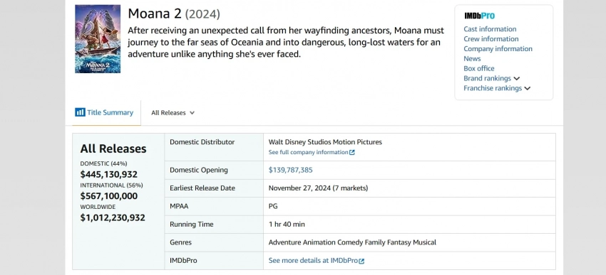 Мировые сборы «Моаны 2» превысили 1 млрд долларов