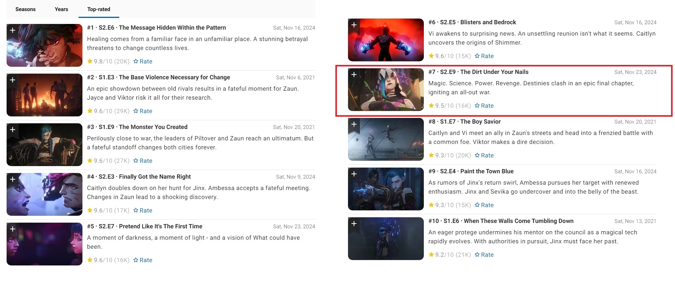 Если вы ещё не посмотрели заключительные эпизоды второго сезона «Аркейна» — бегом смотреть. Финальная серия, 9-я, получила высокую оценку на IMDb, но главным фаворитом зрителей не стала.