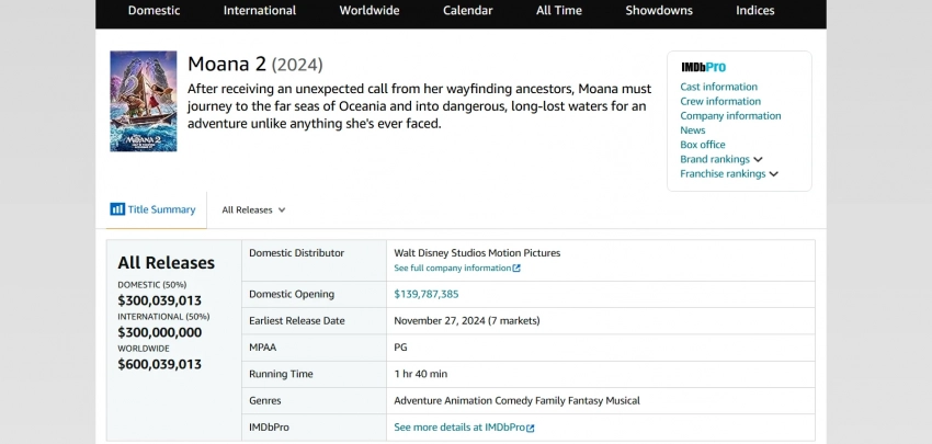 Сиквел «Моаны» встал сразу за второй «Дюной» в топе самых кассовых фильмов 2024 года