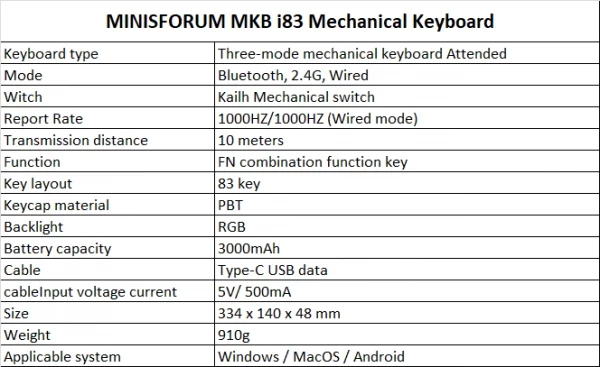 MINISFORUM MKB i83 — это клавиатура, сочетающая в себе элегантность, производительность и универсальность. Он предназначен для геймеров, профессионалов и всех, кто требует совершенства от своих периферийных устройств.