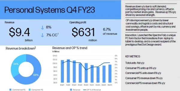 На направлении персональных систем в четвёртом квартале минувшего фискального года HP Inc. выручила $9,4 млрд, продемонстрировав снижение на 8 % в годовом сравнении, причём на две трети она определялась коммерческим сегментом. В количественном выражении поставки продукции в годовом сравнении не изменились, а вот потребительский сегмент показал рост на 9 %, тогда как коммерческий сократил количество реализуемых ПК на 6 %. Выручка двигалась в сторону снижения: в потребительском сегменте она сократилась на 1 %, а в коммерческом просела сразу на 11 %.