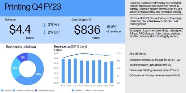 Если рассматривать весь минувший фискальный год, то выручка достигла $53,7 млрд, сократившись на 14,6 % по сравнению с предыдущим, из этой суммы 66 % пришлось на сегмент персональных систем, а 34 % на сегмент печатающих устройств. В коммерческом сегменте 46 % выручки определяли ПК, а вот расходные материалы вышли на второе место по важности с долей выручки 21 %, тогда как в потребительском сегменте ПК формировали только 20 % всей выручки HP Inc. Наконец, устройства печати по итогам года определили 8 % выручки на коммерческом направлении и 5 % в потребительском сегменте. Операционная прибыль в размере $5,5 млрд на 61 % определялась печатающими устройствами и расходными материалами, и только на 39 % персональными компьютерами.