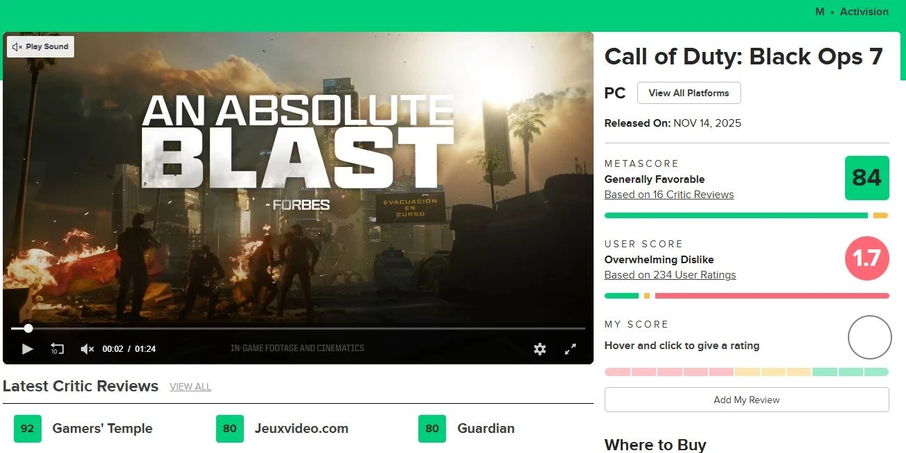 Call of Duty: Black Ops 7 установила антирекорд по оценкам пользователей на Metacritic