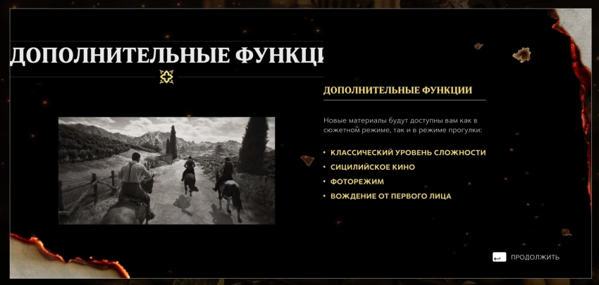 Кроме того, разработчики в Mafia: The Old Country появился классический уровень сложности, визуальный режим «Сицилийское кино», фоторежим и возможность управлять автомобилями и ездить верхом с видом от первого лица.