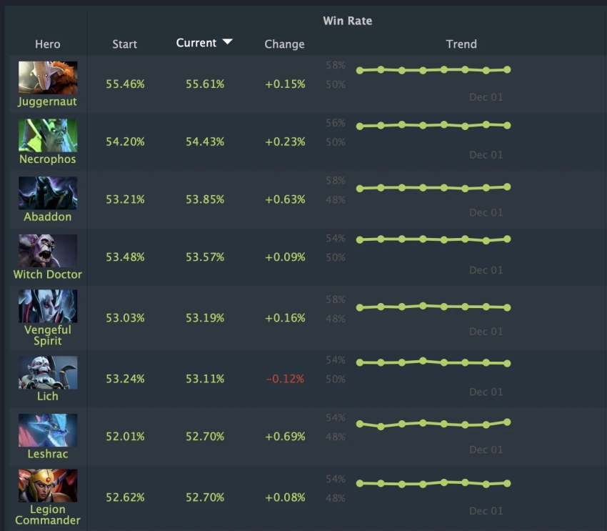 Удивительно, но герой показывает отличные результаты вне зависимости от выбранного аспекта, хотя статистика говорит, что чаще всего победы достигаются с аспектом Bladeform. Ближайшим преследователем лидера в таблице винрейтов является Necrophos, который отстает более чем на процент с показателем 54.20%.