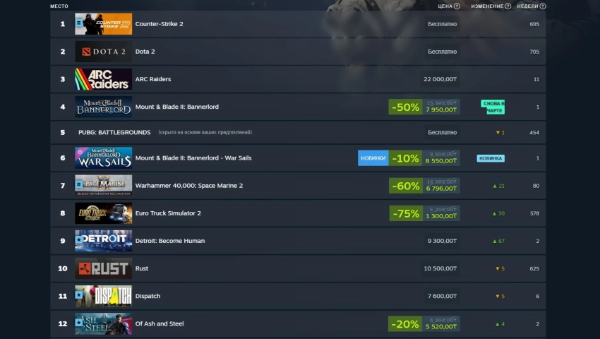 Никаких свежих новинок в первой десятке нет, зато есть игры, которые вернулись туда. На восьмом месте находится Mount & Blade 2: Bannerlord. В чём секрет возвращения в чарт? Средневековая стратегия получила дополнение War Sails, которое заняло 11-е место. А топ-10 закрыла Cyberpunk 2077, продающаяся со скидкой в 65%.