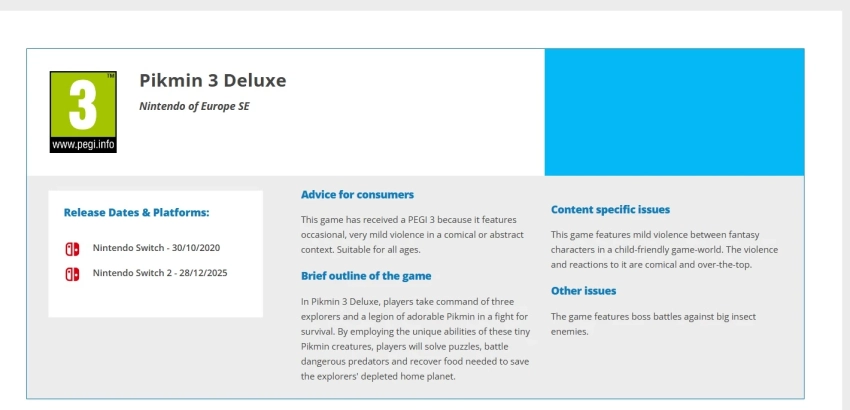 Обложка: скриншот игры Pikmin 3 DeluxeЕвропейское агентство Pan European Game Information выдало возрастной рейтинг Deluxe-изданию Pikmin 3 для Nintendo Switch 2. Это может намекать на скорый релиз.