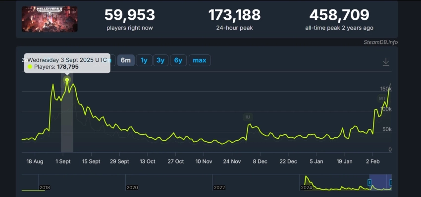 Показатели онлайна Helldivers 2 в Steam за полгода. Источник: SteamDB