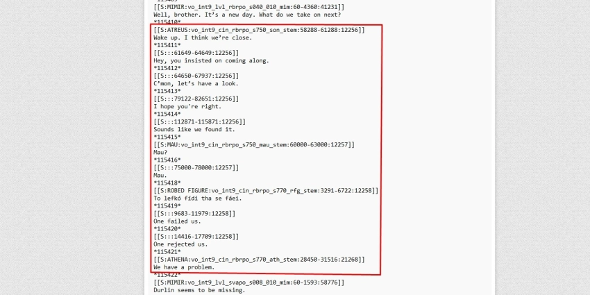 Энтузиаст под псевдонимом TheMorse_ поделился текстовыми строками из файлов God of War Ragnarok, которые могут относиться к нереализованному кинематографическому ролику. В ней Атрей путешествует по божественным пантеонам вместе с существом Мау (Mau), чьи реплики состоят лишь из собственного имени (как у Грута из Marvel). Сын Кратоса, конечно, понимает этот своеобразный «язык» без каких-либо проблем.
