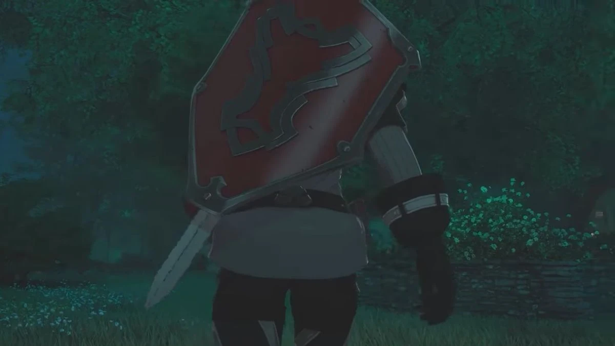 В видео показывают фрагмент локации, выдержанной в средневековом фэнтезийном сеттинге и ситуэт героя с щитом и мечом.