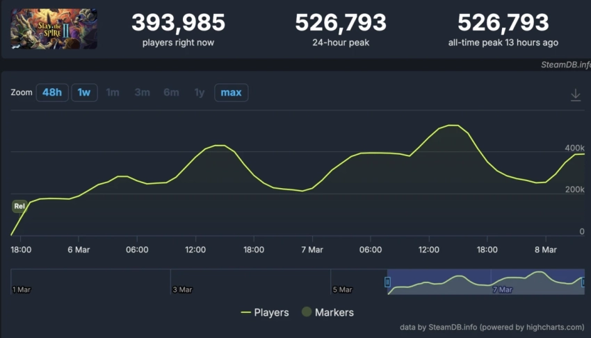 Для сравнения, первая часть — Slay the Spire — во время своего пика в 2019 году достигла примерно 57 тысяч одновременных игроков. Пока сиквел уже собирает более полумиллиона пользователей, оригинальная игра в те же дни показывает около 36 тысяч игроков.