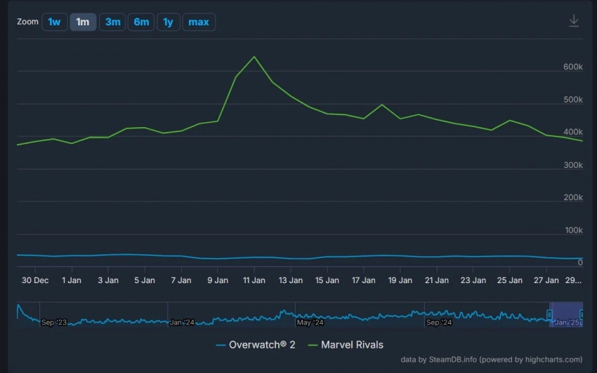 В сентябре, октябре и ноябре 2024 года среднее количество игроков Overwatch 2 составляло около 32-35 тысяч. Marvel Rivals вышла 5 декабря, и, по данным SteamDB, в этом месяце онлайн Overwatch 2 составило 25 тысяч, что на 21,7% меньше.