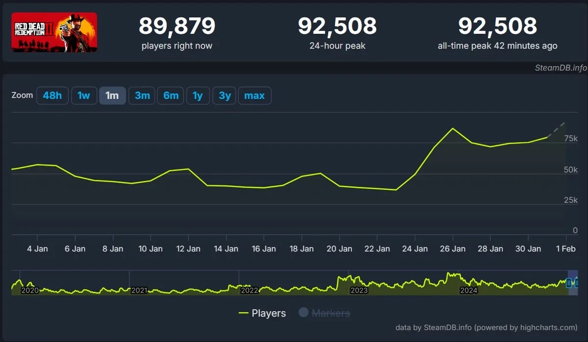 Напомним, что всего несколько дней назад пиковый онлайн игры достиг 86 717 человек. И вполне возможно, это не последнее достижение Red Dead Redemption 2: распродажа, в которой участвует игра, продлится до 6 февраля.