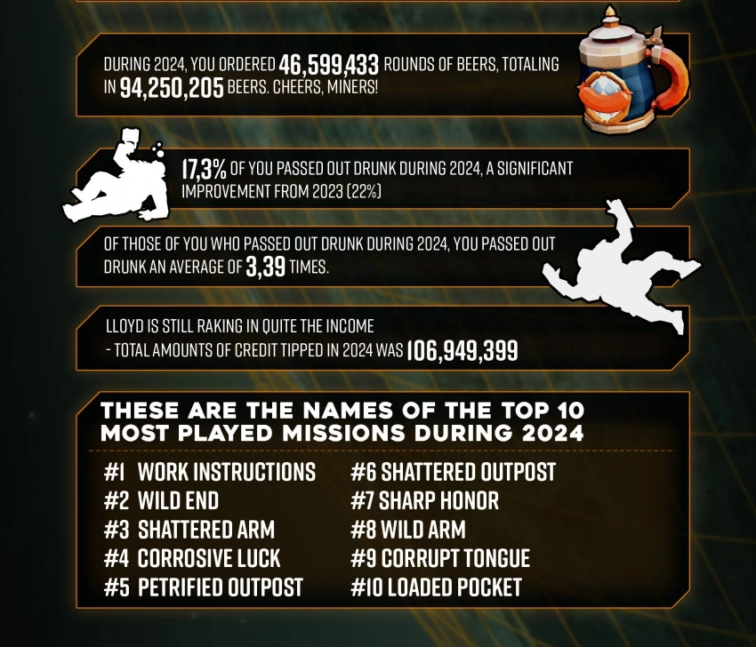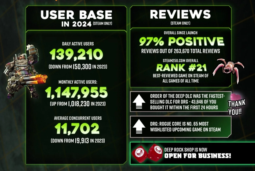 Авторы Deep Rock Galactic опубликовали масштабную инфографику с самыми важными цифрами. К примеру, игроки в Steam за год провели в игре в среднем 48 часов. Аудитория игры выросла втрое с момента релиза в 2019 году. А Order of the Deep стало самым быстро продаваемым дополнением: за первые сутки было продано почти 44 тысячи копий.