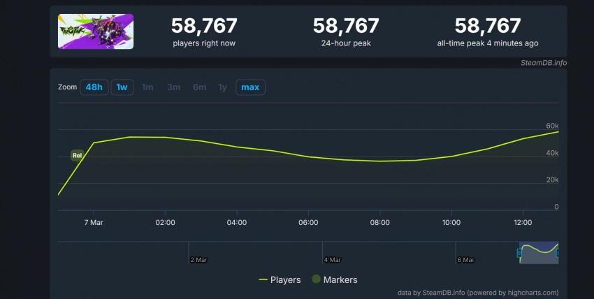 Отметим, что FragPunk доступна в Epic Games Store и собственном лаунчере, однако информация об онлайне будем брать из базы данных Steam. В момент написания новости число единовременных игроков растёт — оно уже приблизилось к отметке в 59 тысяч человек. Это неплохой показатель для дебютной игры (разработчики — Bad Guitar Studio) в новой франшизе.