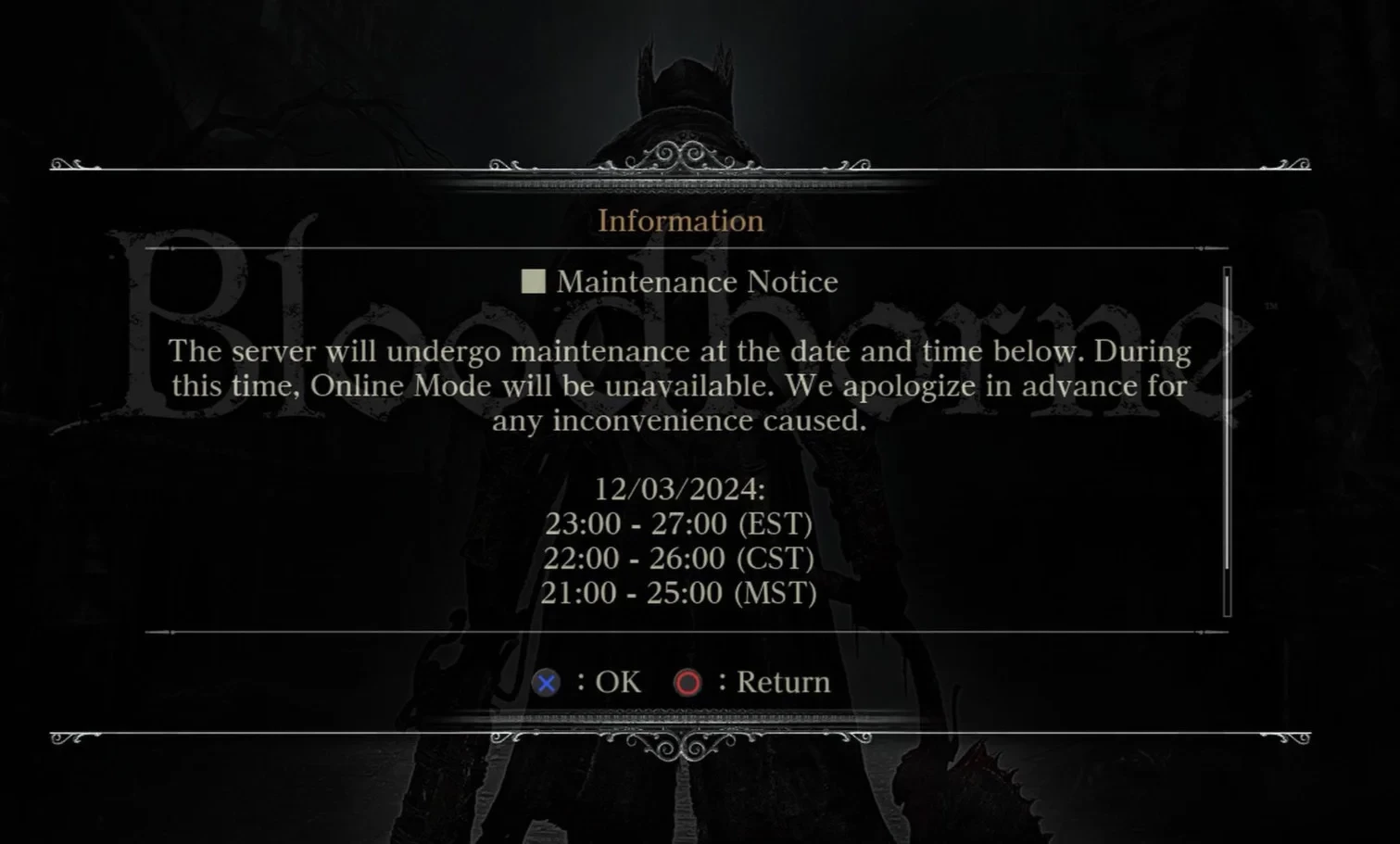 Ещё больше интересных видео на YouTube канале Игромании!Обложка: постер BloodborneИгроки Bloodborne при заходе в ролевой экшен обнаружили уведомление о том, что 3 декабря 2024 года будет происходить техническое обслуживание серверов. Для всех поклонников PlayStation дата будет памятной — известной линейке консолей исполнится 30 лет. Многие посчитали, что обслуживание связано с возможным ремастером или обновлением Bloodborne, но радоваться рано.