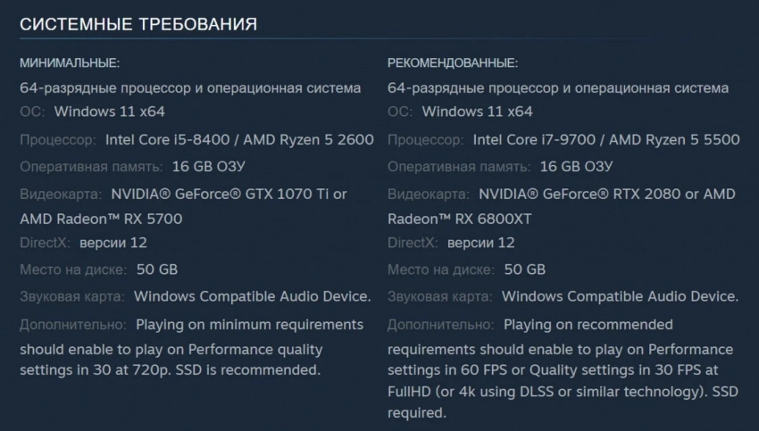 К слову, у игры уже известны системные требования, а ее размер на диске составит 50 ГБ. Ознакомиться с ними можно ниже.