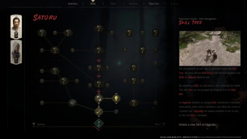Чуть выше я написал о потенциальных новых умениях героев. Вот, к примеру, два дерева развития основных персонажей. Обратите внимание на шкалу в самом низу: она показывает характер протагониста. Мы видим, что Сатору может идти по пути самурая или действовать в духе бесславного ронина, а Акира может сохранять хладнокровие или быть теплосердечным.