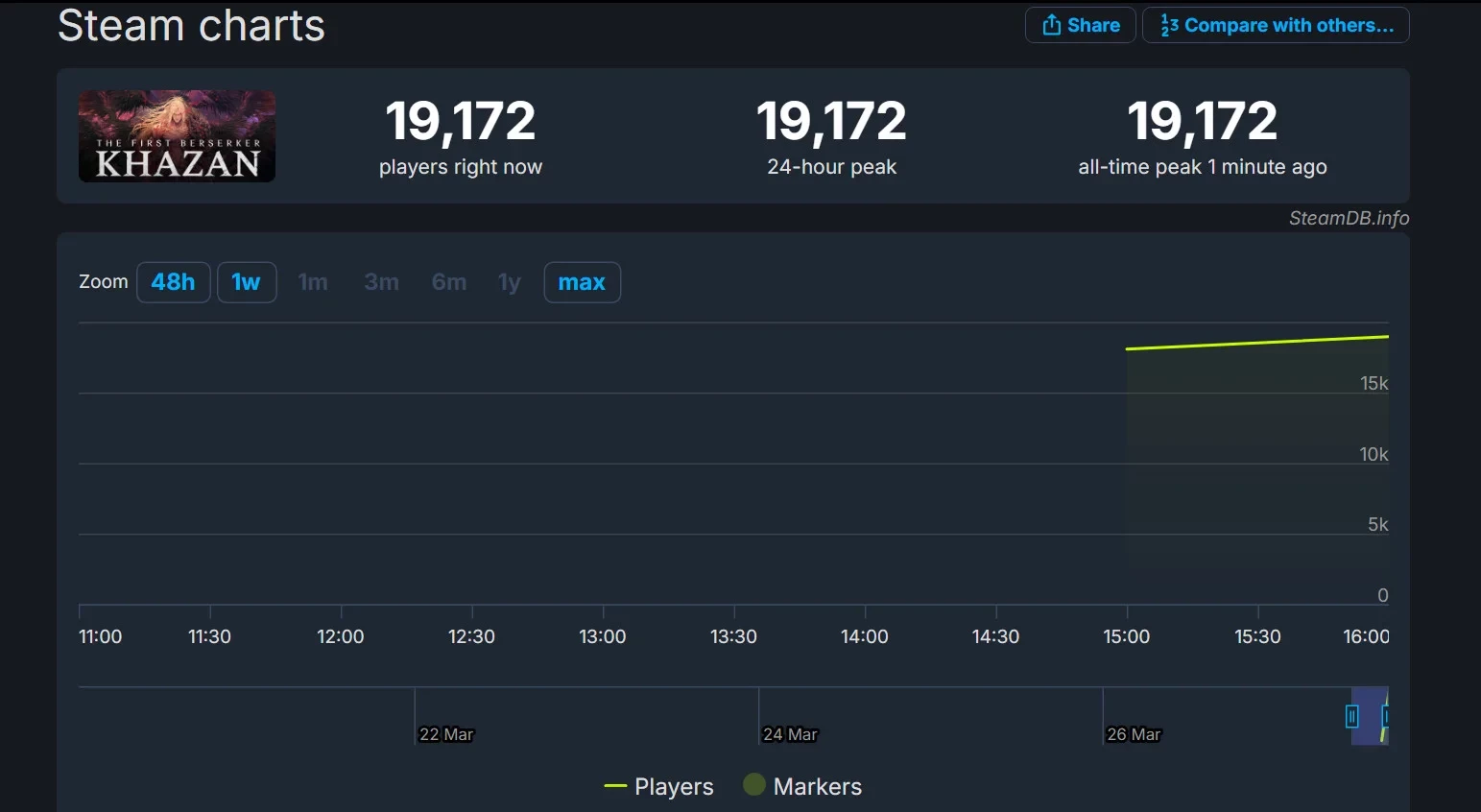 В момент написания новости пиковый онлайн The First Berserker: Khazan в Steam превысил 19 тысяч человек и продолжает расти. Возможно, разработчики смогут добиться гораздо более высокой отметки в пятницу вечером или на выходных.