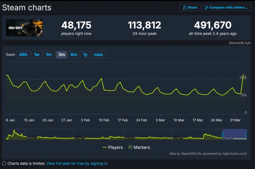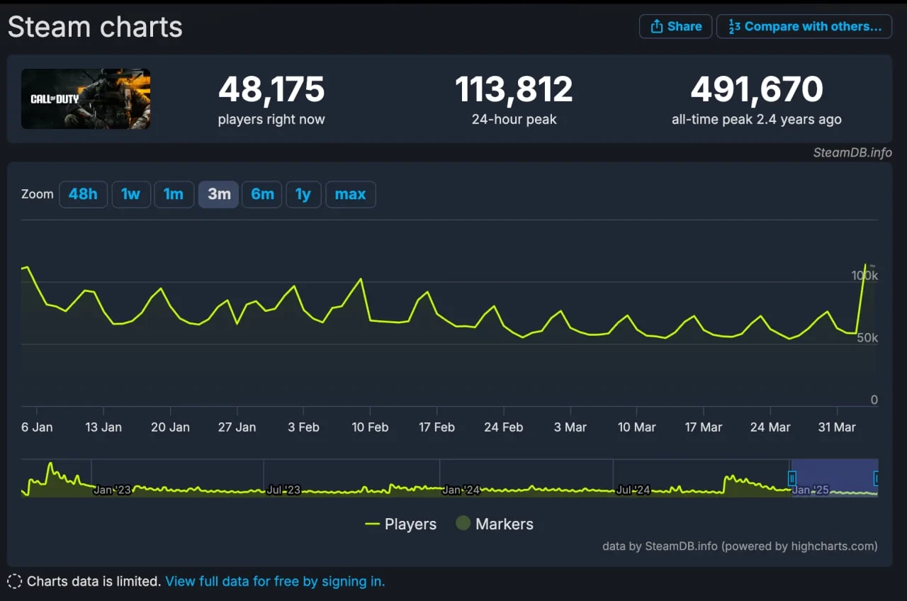 Релиз третьего сезона в Warzone и Call of Duty: Black Ops 6 помог и числу одновременных игроков в Steam, которое подскочило более, чем на 200% (по сравнению с предыдущим периодом).