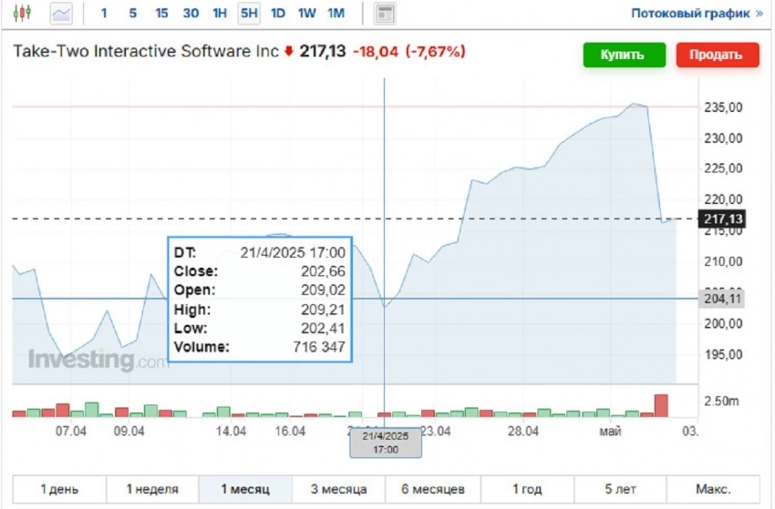 Увы, акционеры ход Rockstar Games не оценили. Акции Take-Two Interactive за прошедшие сутки упали на более чем 7% — до 217,06 доллара. Однако даже за прошедший месяц стоимость одной ценной бумаги издателя опускалась ниже 205 долларов, поэтому назвать текущую ситуацию критической никак нельзя.