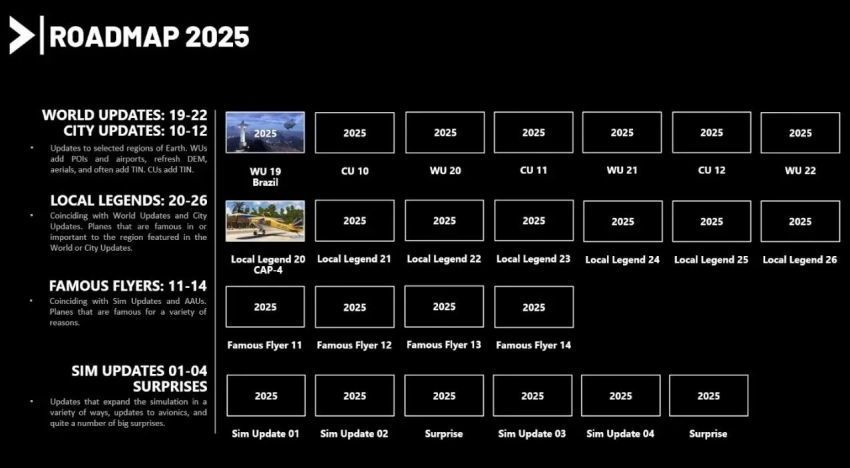 Всего в 2025 году создатели готовят четыре пакета World Updates и три City Updates. Нас ждёт три платных легендарных самолета, а также четыре модели Famous Flyers. Разработчики готовят четыре крупных обновления и два «сюрприза», о которых пока что не хотят говорить.