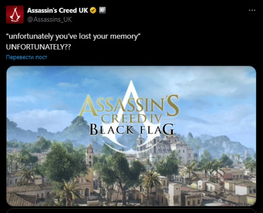 Речь идёт про Assassin’s Creed IV: Black Flag. Несмотря на серьёзное отхождение от тематики ассасинов, многие поклонники любят четвёртую часть за харизматичного героя, пиратский сеттинг и уникальные механики. И подобный пост многие фанаты приняли за намёк на ремейк Black Flag, слухи о котором ходят уже некоторое время.