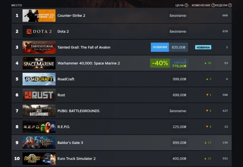 В российском чарте опять новинка: мрачная ролевая игра Tainted Grail: The Fall of Avalon, созданная польской студией Questline. А ещё неожиданный камбэк: в десятке вновь красуется прославленная Baldur’s Gate III.