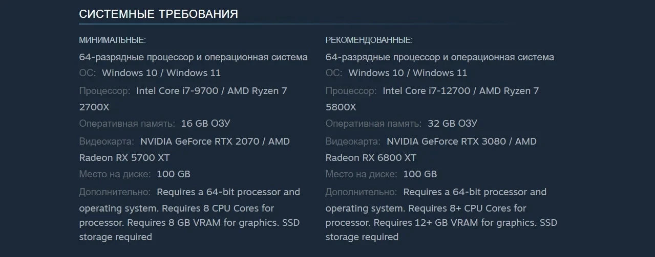 • Процессор — Intel Core i7-12700 или AMD Ryzen 7 5800X