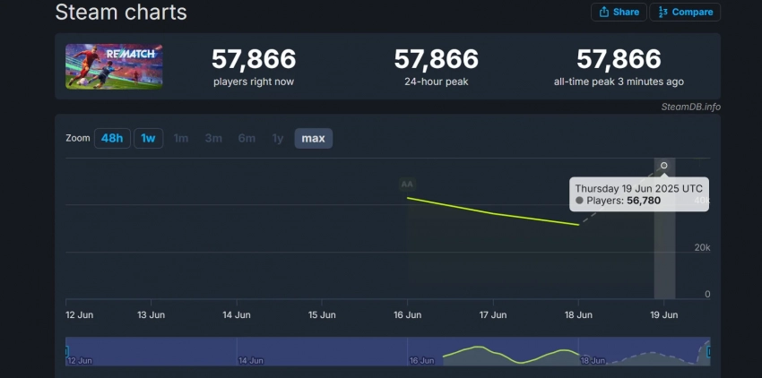 Что касается Rematch, то игра уже успела обновить свой рекорд пикового онлайна после выхода — в момент написания новости в аркадном футбольном симуляторе находится почти 58 тысяч человек. И наверняка в ближайшие часы или на выходных это значение значительно вырастит — бета-версия привлекла к себе около двух миллионов игроков, а также достигла пика в почти 160 тысяч геймеров.