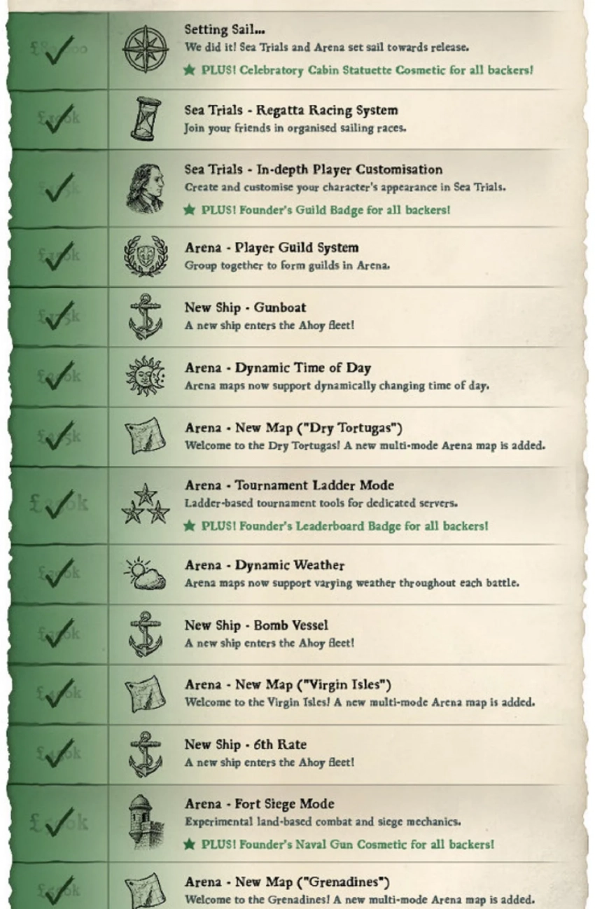 Наивысшей целью в Capstan Games назвали сбор почти 878 тысяч долларов — за достижение этой цели игроки бы получили социальный хаб для общения с друзьями и отдыха между морскими сражениями. Также собранных средств не хватило для добавления дуэлей в режиме арены, ещё одной карты и «специального» оружия — гранат, трёхствольных пистолетов и не только.