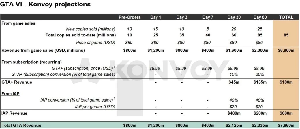 Кроме довольно очевидных прогнозов вроде того, что GTA 6 станет величайшим релизом в индустрии, в Konvoy также ожидают, что общая выручка игры за первые 60 дней (или 2 месяца) превысит 7,6 млрд долларов!
