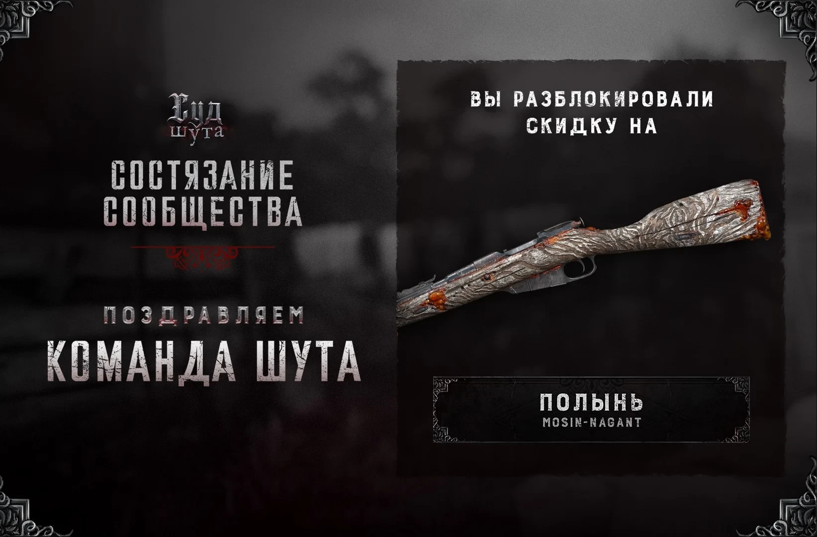 Также в Hunt: Showdown 1896 завершилось событие «Суд Шута», в котором игроки должны были совершать убийства, разделившись на две команды. Победу в соревновании одержала сторона Шута (414 932 убийства против 391 557 у команды Судьи). В честь этого во внутриигровом магазине стала действовать скидка в 90% на «Полынь» — в течение недели пушку можно приобрести лишь за 70 кровавых облигаций.